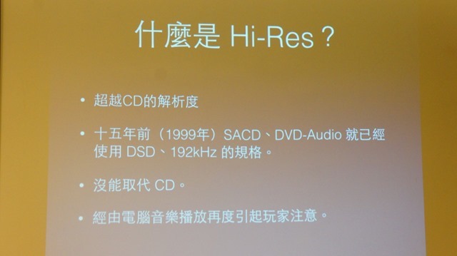 什麼是Hi-Res?劉名振先生他的定義是:「超越CD的解析度」,而早在15年前,就有廠商推廣等同於Hi-Res的SACD(廠商:Sony+菲利普)與DVD-Audio(廠商:Panasonic)兩種規格,但因為種種因素,未被普羅大眾接受,因此還是沒有取代掉CD。不過,因為現在多數人聆聽音樂的來源,已經從CD轉到數位檔案,所以對高解析度音樂格式需求又出現了。