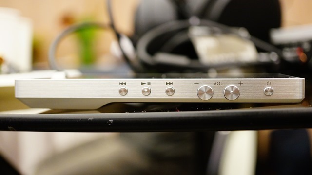 從耳機傳輸孔這一邊來看,最左邊接孔是傳統單端介面(輸出功率各聲道100mW),因此一般非平衡耳機都可以連接使用。至於標示「BALANCE」,且清楚註明 L 、 R 左右聲道的兩個接孔(輸出功率各聲道320mW),則是平衡傳輸使用。至於最右側的黑色旋鈕,則是電源開關並做為音量調整使用。