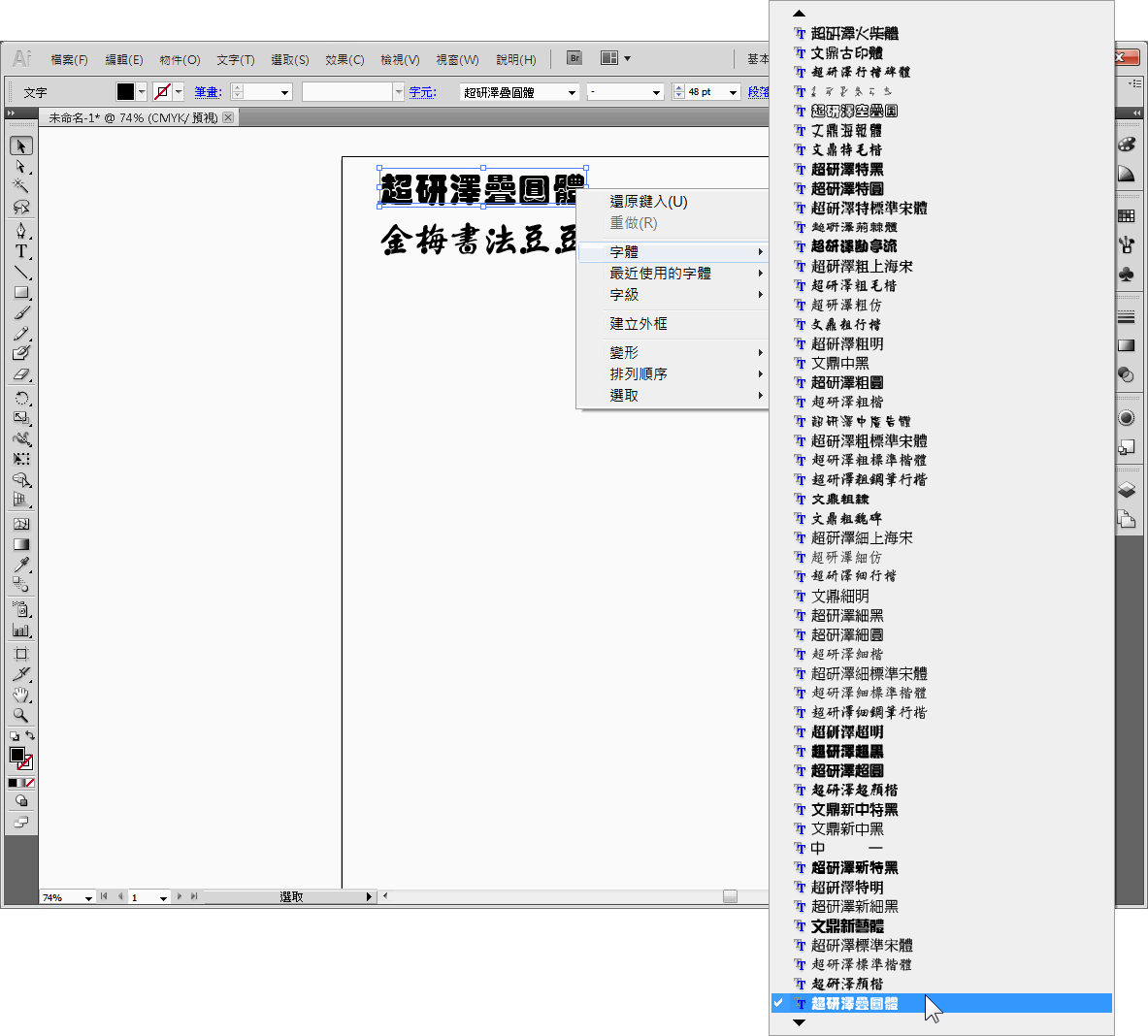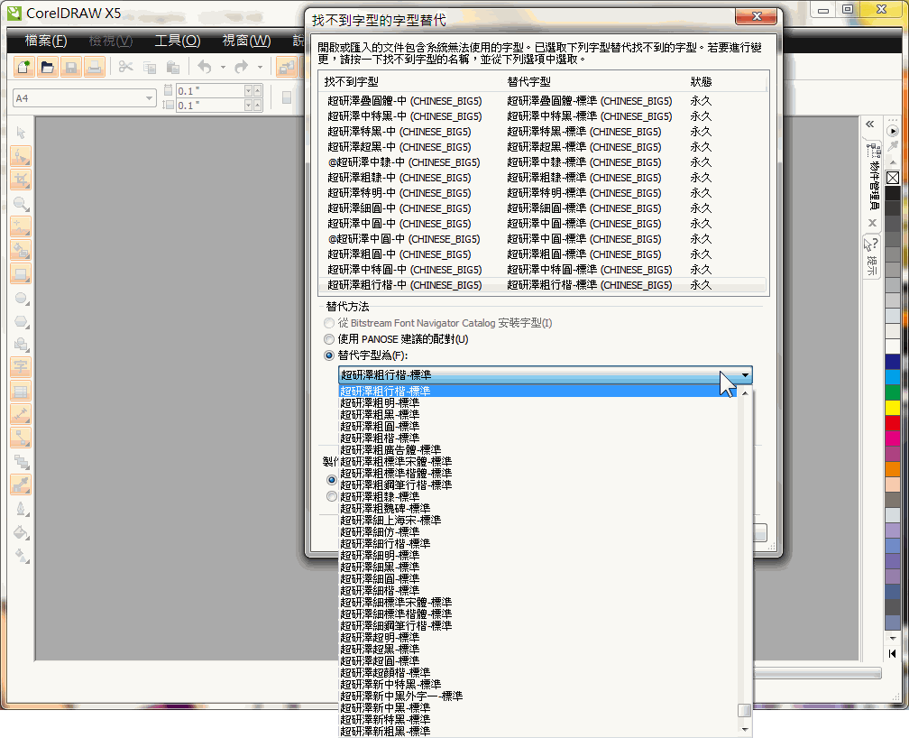 而要是使用PANOSE建議的配對來使用,裡面卻沒有超研澤的字型可以選(字型明明就裝了卻看不到)