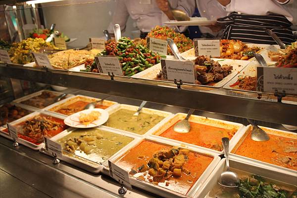 美食街中通常還會有一攤,就像台灣的自助餐廳一樣,櫥窗裡一個個的方型鐵盤中擺滿了各式各樣料理好的食物(有炒菜、打拋豬肉、綠咖哩雞…等等),我們姑且就稱這一攤為"泰式自助餐"。和台灣的自助餐一樣,你只要用手指你想要哪幾樣菜,店家就會把你點的菜放到裝好飯的盤子裡,然後你就可以拿著放著好幾樣菜的餐盤去吃飯了。不過因為菜都是事先煮好的,所以常常會遇到食物不夠熱的狀況,因此並不是很推薦。