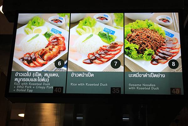 賣鴨肉麵的攤子除了會看到一隻隻皮烤得酥脆的燒鴨外,通常還會看到一大塊外皮炸得酥脆的叉燒肉。這一攤除了麵,飯類更是它的主打,這攤要推薦給大家的兩種飯類小吃就是”脆皮豬肉&叉燒飯”;(ข้าวหมูแดงหมูกรอบ)以及”燒鴨飯”(ข้าวหน้าเป็ด)。