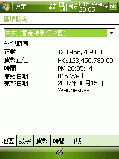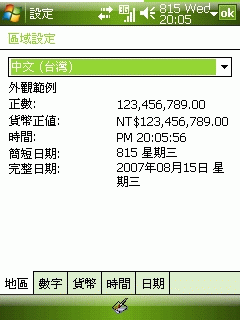 tchk wrote:感謝MARK大大的分...(恕刪) [WM6-PPC密技]讓你的CHT9100待機畫面顯示星期X...(圖文教學)或是去參考[WM5-SP密技]用最簡易的方式讓你的待機畫面顯示星期X...(圖文教學)beatnik wrote:開始 設定 系統 區域設定 改成台灣即可...(恕刪) 之前經實驗證明,你說的這種設法不一定會顯示出來唷~至少我的9100是這樣喔!