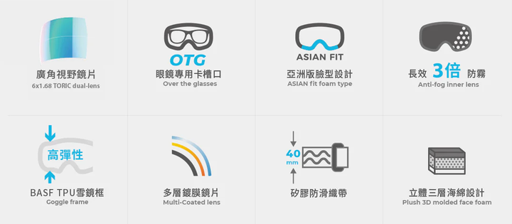 - UV400抗紫外線、多層鍍膜、雙層防霧鏡片