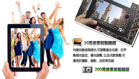 機身具有30 萬前置攝影鏡頭及200 萬後置攝影鏡頭,9.7 吋 LED 背光多點觸控面板反應順暢流利,可同時享受 1080p 高解析影片與串流高畫質 Flash 動畫,為您打造精彩豐富的行動多媒體生活!