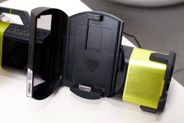 切換STEEZ音響為AUX IN模式。「行了,來聽聽看我的首次創作成果吧」。