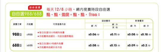 另外,台灣大哥大除了原本眾所皆知的超強收訊品質之外(再便宜、打不通也是枉然啊!),台灣大哥大自由選688/988提供了四種時段、8~12小時的免費網內通話,無論你習慣早上、中午、還是晚上開始講,完全可以依照自己的生活作息,輕鬆選到適合你的網內免費通話時段!