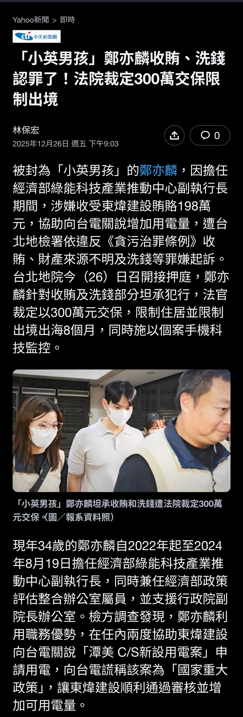 「小英男孩」鄭亦麟收賄、洗錢認罪了!法院裁定300萬交保限制出境