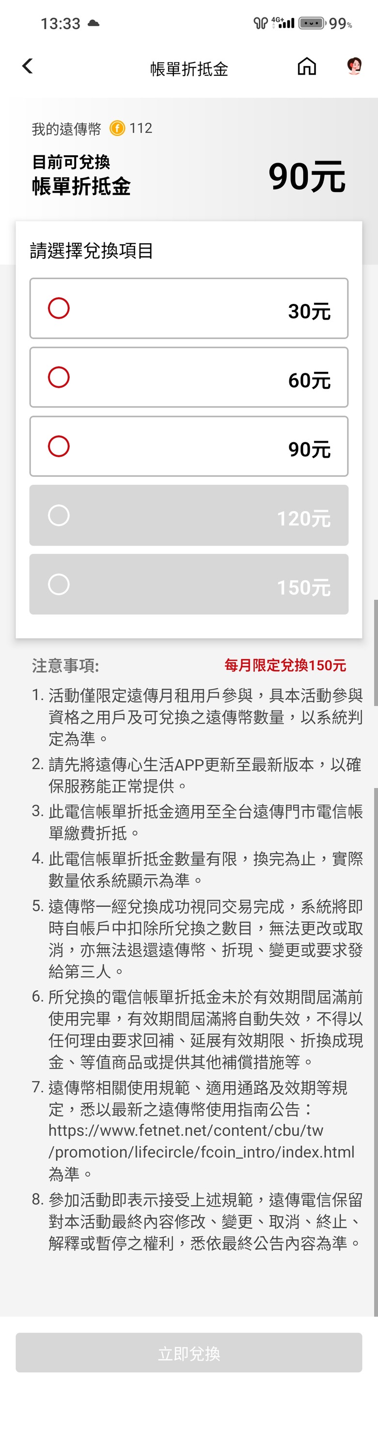 月租贈送的虛擬幣效期只有一個月(印象中不是,LM111之前每月回饋的效期好像是一年,可惜現在沒送了,不確定是否還如此)?如果不是,累積到下(下)次換不就好了(90、90、120)!