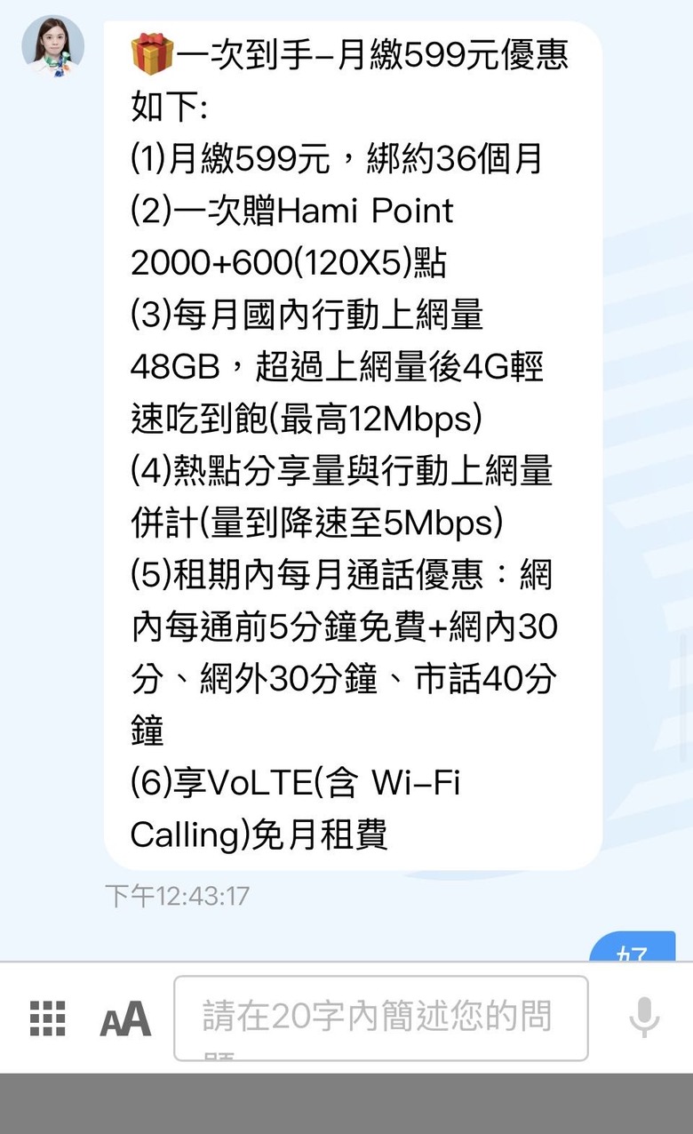 f1022 wrote:我目前每個月上網的用量大概在30G左右,所以客服給的方案其實也足夠我用!不知道選擇哪一個比較好?你問線上客服,很難能夠續約488。我續約488,均是電銷來電續約。有一次,是在合約期滿前兩...
