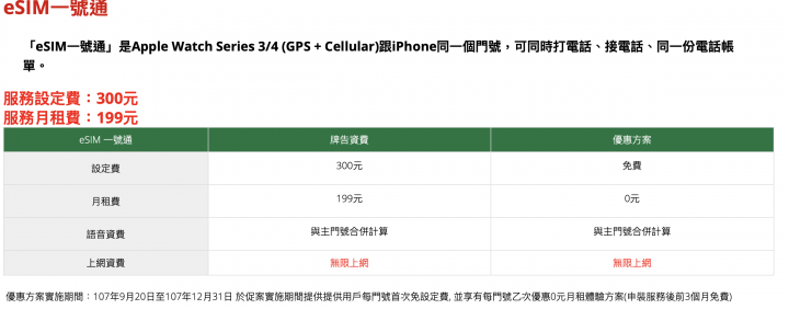 我有問題要請教大家我有搶到11元方案請問 AW4 LTE 用的esim 服務 是不是可以免費開啟?這是我剛剛去官網抓的有寫 第一次免服務費 免月租費所以如果真的是這樣就太爽了手機跟手錶都可以用 比耍人的台星8...