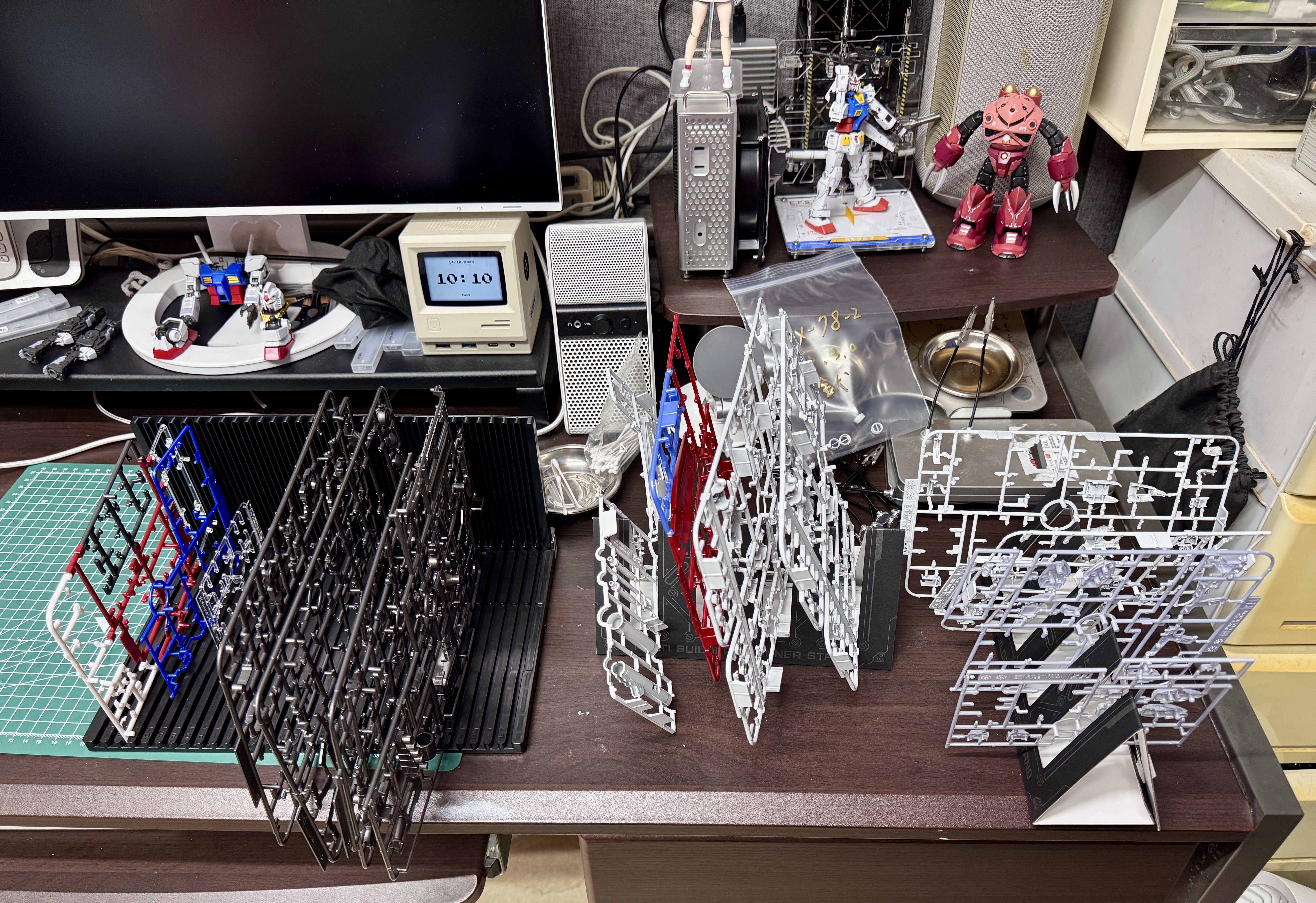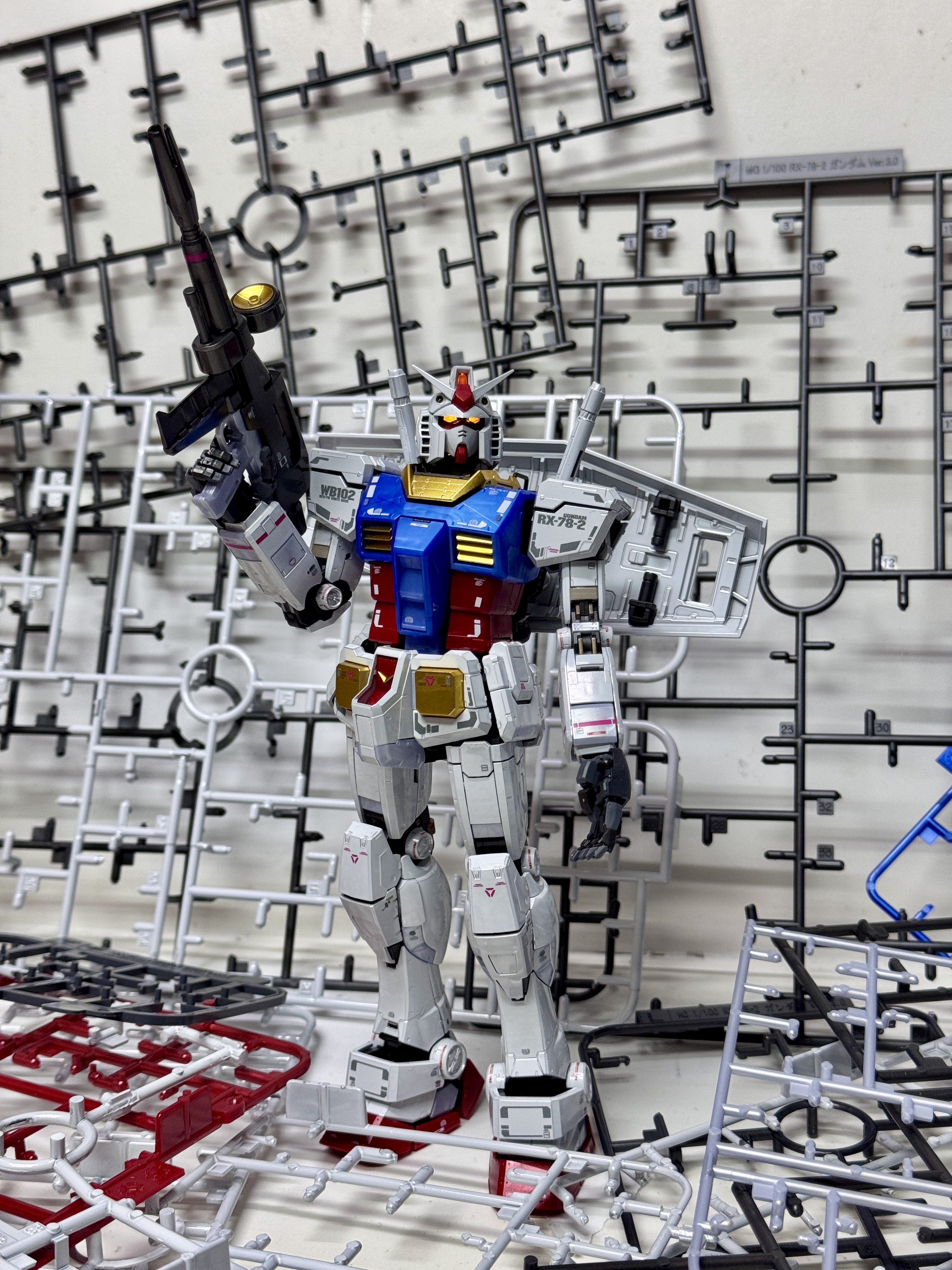 おはようございますA ~ L 框架的鋼彈終於組完了。貼貼紙又是魔咒。1/100的比較好貼一點。這隻頭部可以裝led燈,眼睛會發光。