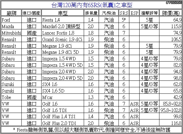 國產Fortis 2.0(旗艦型)/Accord 2.4(VTi-S)與進口RAV4 2.4(G尊貴版/4WD旗艦版)...紛紛拿出完整安全配備(6SRS),值得鼓勵;請大家多多宣導6SRS的重要性!!!側撞-...