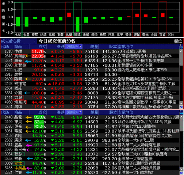 "1.類股分析:(1)強勢類股:百貨、運輸(續強)、化學(2)弱勢類股:玻璃、食品、水泥(3)分析:單向盤台星簽FTA利多開高震盪收低,8000點遭遇壓力回測7900,電子類休息資金比重縮水、金融股扮...