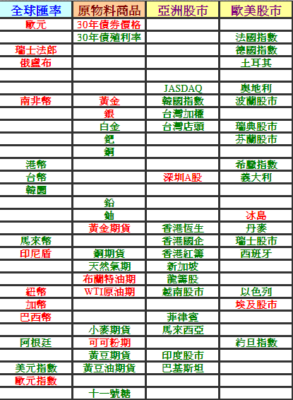 以後每周五會幫大家分析全球局勢不但可以增廣自己的視野並且在投資基金可以做個參考要投資全球就要從三個方向來看匯率->原物料->世界股市本週資金做了那些移動呢?[ 這張圖是以一個月為周期,價格表現強勢的就會亮紅色,...