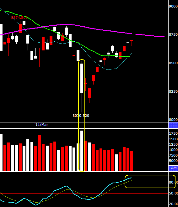 上週五台股盤中震盪之後最後一盤拉了23點讓收盤以最高點附近作收在台股連假期間國際股市也紛紛震盪上漲使得多頭氣氛越來越明顯日本核災的恐慌似乎已經被拋到一邊了來看看上週五的加權走勢圖中可以看到在3/15那天出現恐慌...