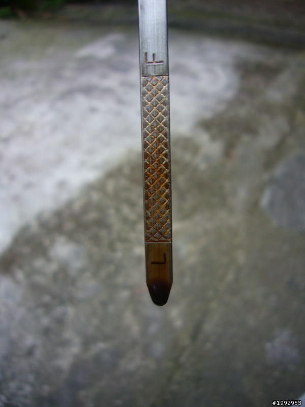 這是我的99年化油馬所使用的機油尺也用了7~8年了, 一直都很正常,就像下圖...很完整的一支...不過,天有不測風雲昨天換機油時拔下一看,心中一整個OS...怎麼短了一截...那個..如下圖中的銀色鋁質小頭....