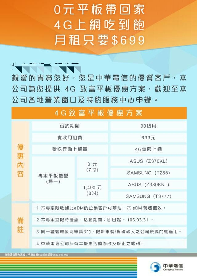手機門號是公司名下的剛剛手機收到一通簡訊致富平板企客專案,只能憑此簡訊申辦699吃到飽,不過不知道有沒有贈送分鐘數如果沒有分鐘數,條件比現在的699還差...應該是為了再洗一波企業客戶推出的下個月還想699吃到...