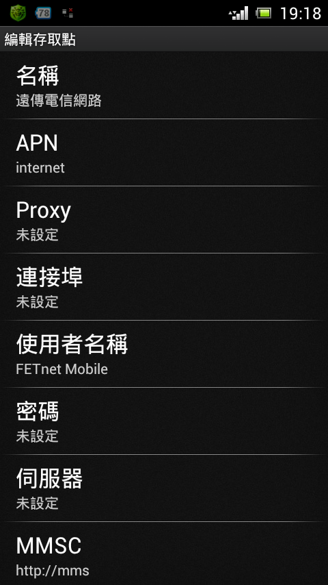 ARC S 的存取點名稱APN選項有“INTERNET” (INTERNET)“遠傳電信網路”(INTERNET)“遠傳電信網路MMS”(fetnet01)剛剛更新4.0之後,我很怕行動網路設定會錯誤導致多付網...