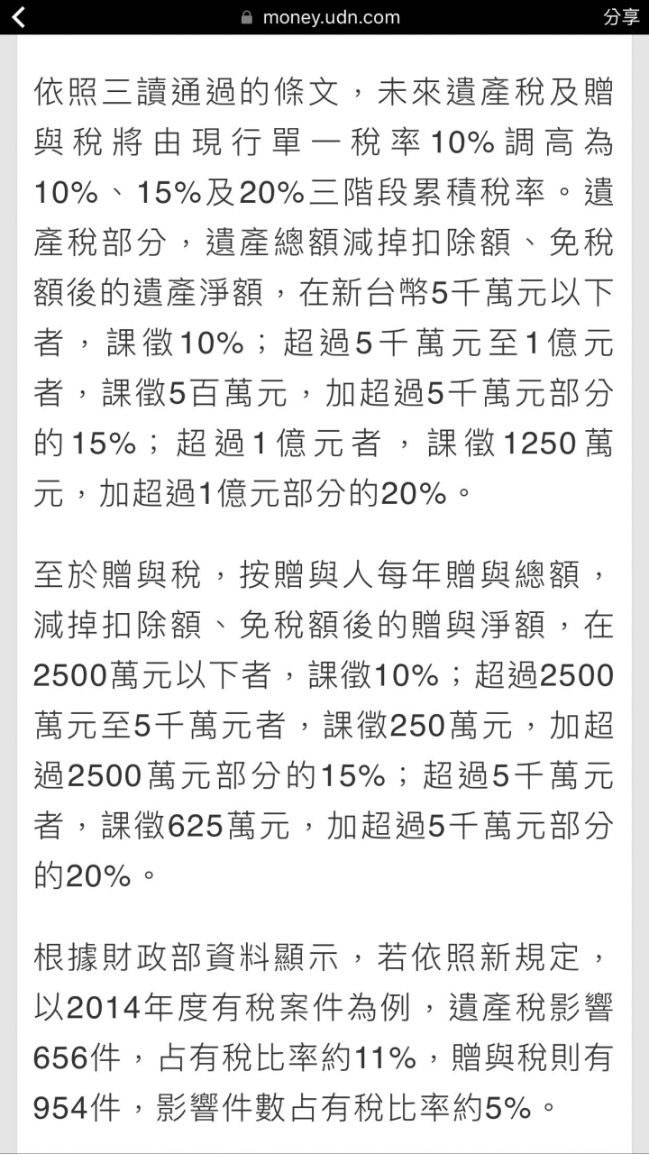 過低的遺產稅率成為貧富世襲的元凶?台積電董事長張忠謀批評,「台灣遺產稅不應調降」,五年前遺產及贈與稅率一口氣降到百分之十是「錯誤的政策」,不利創造均等機會,「我絕對贊成調高」。最大的不公是「資本利得稅」稅制,包...