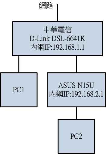 各位好,有問題想要請問一下各位,我家裡的網路and電腦配置如下圖因為最近有wifi的需求,所以多買了一台asus n15u來讓其他行動裝置上網,但是n15u的內網IP是 192.168.2.1,中華電信那台dl...