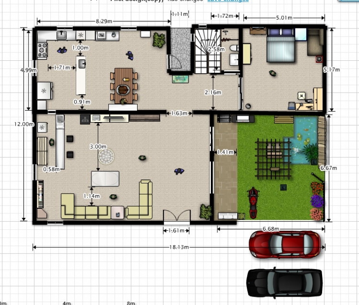 在網路上找到室內設計的網站設計了式己喜歡的方式當然地坪是隨便亂拉的1樓+庭院 18乘12 的平方公尺 = 65.34平方公尺 = 19.7坪2樓扣掉庭院和外推陽台不計 18乘5.31 + 10.89乘6.67 ...