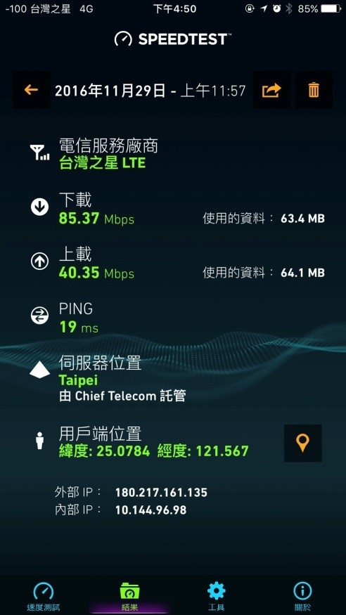 先前內湖堤頂路易莎隨手測手機iPhone7+在信義區速度也不錯599勁速方案這速度很划算了