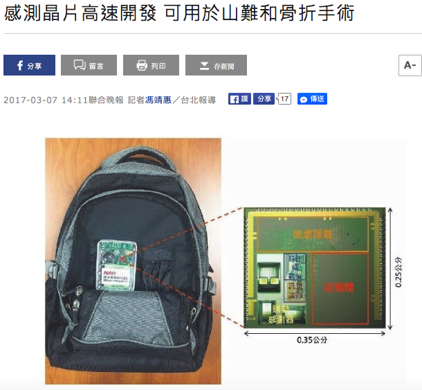 國家實驗研究院晶片中心研發出「感測晶片高速整合技術」未來登山者在背包裝置感測晶片,當背包快速大幅移動就可能是登山者跌落山谷,此時會立即發出求救訊號給指定對象對方手機也會顯示登山者的精確座標位置,便於立即展開救援...