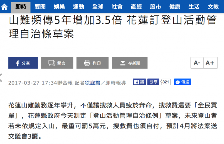 文章來源:聯合報預計4月將法案送交議會3讀花蓮縣消防局長林文瑞說,花蓮境內高山林立,熱門登山路線多海拔3000公尺以上山岳約有43座一年四季都有登山隊申請入山,或是私自進入需要申請的國家公園生態保護區等往往卻發...