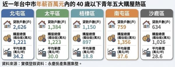 多開5分鐘車省百萬!太平「房價凹陷區」磁吸首購族記者陳筱惠/台中報導台中市根據統計聯徵中心貸款件數及實價登錄資料,2024年第3季到2025年第2季期間,以年薪百萬元以下、40歲以下青壯年最熱門的5大購屋區域出...