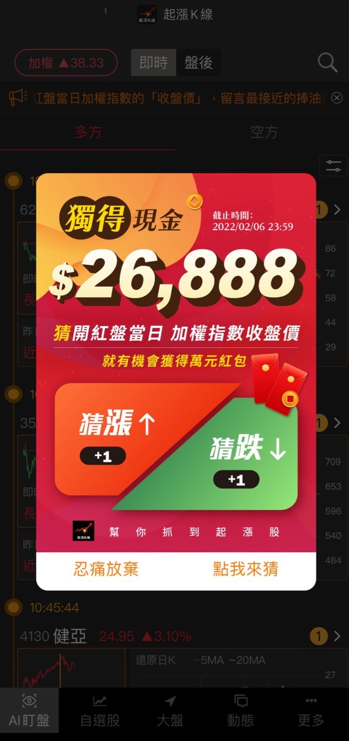 《起漲K線》APP辦過年抽紅包活動!只要留言猜 開紅盤(2/7)那天「收盤價」是多少就可以抽2萬多元的紅包!開啟APP就會有通知跳出來要你留言來猜囉個人覺得要猜中實在太難了QQ但有猜還是有機會!!而且只要最接近...
