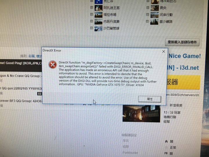 最近剛組了一台電腦 配備是Cpui7 8700顯卡技嘉1070ti windforceRam 8g*2顯卡驅動程式為最新416.34版本,要開啟戰地風雲3的時候會出現錯誤對話框請問是哪裡出錯呢?