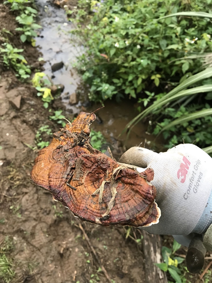 今天突然發現被鋸掉的芒果樹頭長了一片靈芝,好驚喜呀!長大點應該可以吃吧!?之前在另棵龍眼樹幹也看過長了木耳!