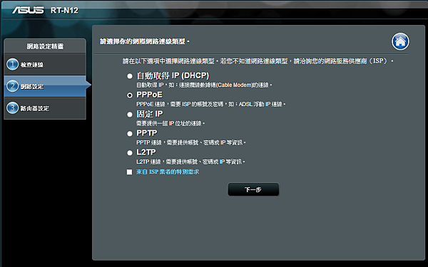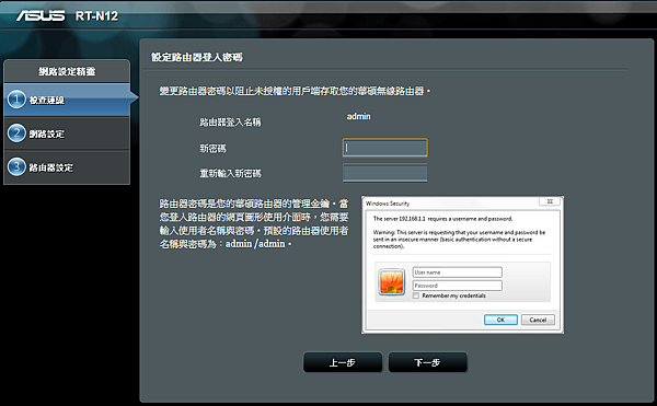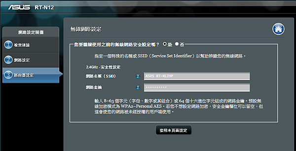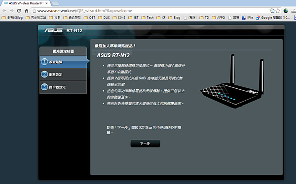 用筆電接上RT-N12 HP的LAN,並且將RT-N12HP的WAN接上中華電信小烏龜後,開啟瀏覽器,會自己連上ASUS WRT的管理介面,而且預設就會跳出30秒安裝精靈,接下來只要一步一步照著做,基本上我在15秒就完成所有設定,而且連上網路了,不過記得更換一下密碼,避免被別人連入