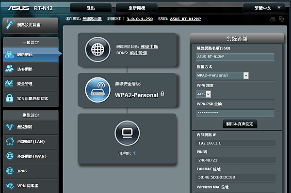 完成設定之後,可以看到簡潔有力的網路地圖,右手邊的系統資訊會將所有重點資訊都秀出來,例如內部IP &外部IP,以及多少人連上網路