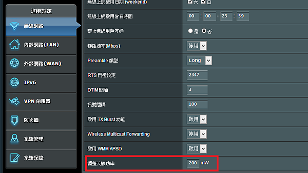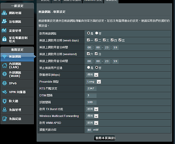 而無線網路的專業設定標籤裡面,也有很方便的上網管制,可以自行設定上班日與非上班日的開放時間,這對於公司行號相當有幫助,而在最下方,甚至可以調整天線功率!!