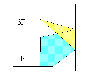 此時1F & 3F 要各放一個 AP, 用指向性天線指向對面建築物牆壁, 3F 往下指, 1F 往上指, 這一段跑 WDS.