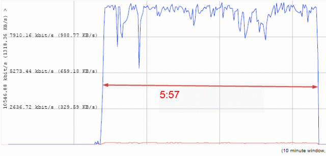 來探討一下, 看 1080P 的 youtube 要花多少頻寬:我剛剛去看了一下一個 1080p 15min 的片子, 在 10M/2M 的線路上, 得到的結果是,如下圖, 約 6 分鐘就全部下載完成, 經查整個檔案是 418MB. 平均速率是 1.16MB/s, 意思是對 10M/2M 線路而言, 是全速下載.以不 LAG 的條件下, 假設以八成的速度下載, 即 15分鐘的片子, 12 分鐘下載完, 相當於 580KB/s 就夠了.所以, 一條 10M/2M 的線路, 如果別的什麼事都不做, 維持 2 個人同時在看 1080P, 應該 OK.50M/3M 的線路, 假設沒有 WAN 以外的外在網絡塞車的條件下, 推算應該就可以 10個人同時看 1080P youtube.為什麼 50M/3M 讓 5 個人看 1080P youtube 還不行? 理由當然是:1. 網路又不只是光在看 youtube.2. QOS 沒設, 或沒設定好.3. Router 爛!?1. 和 2. 在解決問題的想法上, 應該是同一件事....真的是 3, 當然就換機器, 換 Firmware.照上面的推算, QOS 好好設定的話, 50M/3M 的線路, 應該可以花 30M 讓 6 個人看 1080P youtube 片子, 剩下 20M 來做別的事.這樣還會 LAG 的話, 應該就是這些沒受 QOS 控制的 "別的事" 強勢地占掉了太多的頻寬.如果直接連線中華數據機還會 LAG, 那是外面塞車, 就不關 Router 的事了.結論: 先設好 QOS, 真的不行再說.