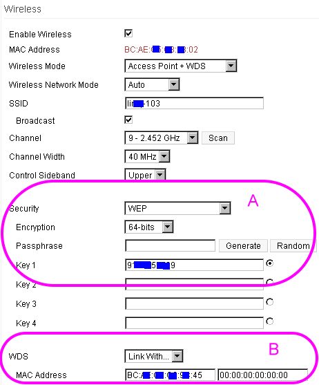 我的連線如上圖,RT-N16(1)用WDS連線到RT-N16(2),請教2個問題。如下圖所示,1.兩台RT-N16之間的連線速度應該只和WDS有關係(B),和『A:WEP加密』、『C:MAC設定』無關吧?2.電腦連到RT-N16的速度和『A:加密方式』或『C:直接鎖MAC』有關?請問這個觀念正確嗎?JLV1818 wrote:我的例子是兩台N16, 設定過程不詳談了, 最後發現最高速及最穩定的設定是:將無線加密關閉, 相同SSID(可選擇隱藏)