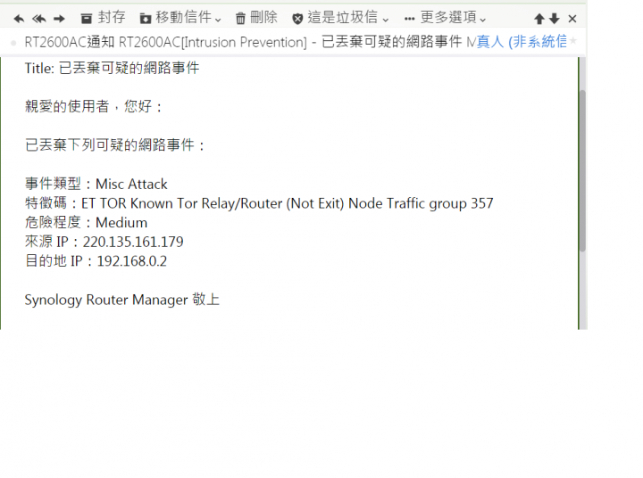 剛剛啟動Intrusion Prevention功能,更新了特徵碼,選擇"預防模式(偵測及丟棄惡意封包)"啟動事件通知後沒理它,過幾分鐘而已,已經有事件發生,也寄到我設定接收信箱!這......................好恐怖啊!請問紅框內的事件需要drop該封包嗎???我看我還是在RT2600ac之後再加一台Router好了!