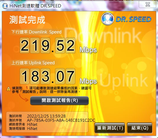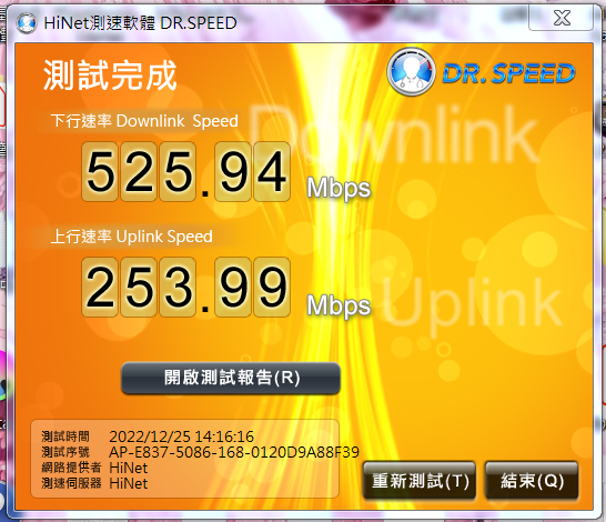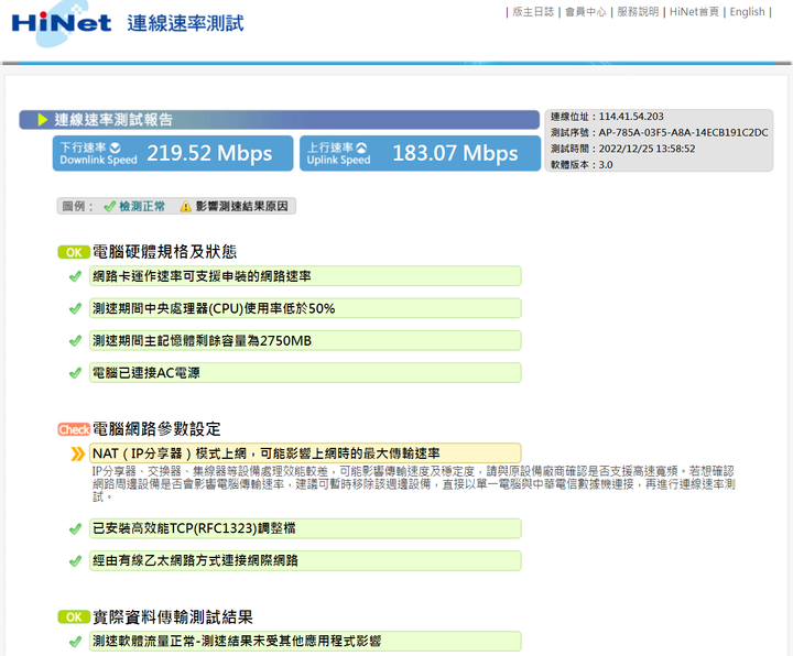 測試畫面:開啟測試報告:NAT(IP分享器)模式上網,可能影響上網時的最大傳輸速率IP分享器、交換器、集線器等設備處理效能較差,可能影響傳輸速度及穩定度,請與原設備廠商確認是否支援高速寬頻。若想確認網路周邊設備是否會影響電腦傳輸速率,建議可暫時移除該週邊設備,直接以單一電腦與中華電信數據機連接,再進行連線速率測試。同時間有設備在下載也會影響測試結果的!(剛剛小朋友在用手機!)正常的:因為板主有測試速率是有達到300M !表示同一時間是有一些外在因素影響的!