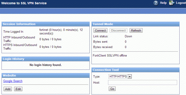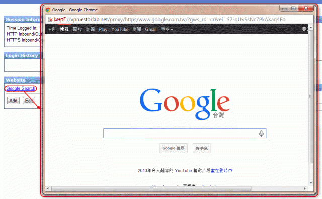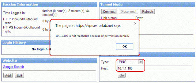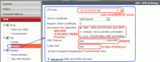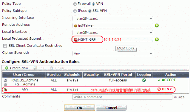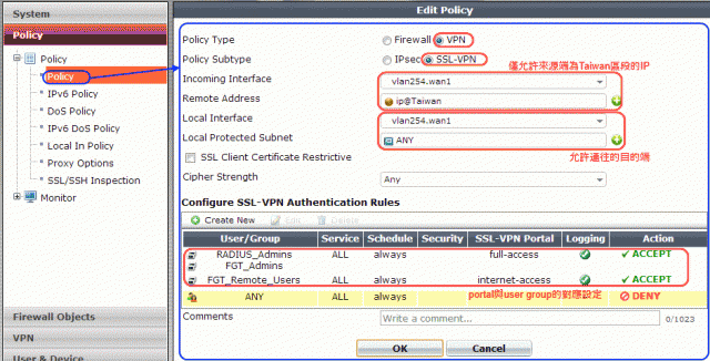 How to setup SSLVPN for web mode....本篇將說明如何使用SSLVPN建立web moe, 首先確定幾個要素:1. web mode使用的ip pool2. 使用的user group3. 允許的目的端在使用web mode的SSLVPN之前, 先設定所屬的global configuration...確認這些公共設定後, 建立允許使用SSLVPN for web mode的user group之後建立允許的目的端的address物件:==outgoing interface: wan1==10.1.1.0/24=> 只能允許管理者群組(FGT_Admins, RADIUS_Admins)ANY=> 允許全部群組使用設定所需要的SSLVPN portal物件, 如下為針對FGT_Remoter_Users的portal:最後設定相關的policy:由於有一個屬於wan1的10.1.1.0/24僅允許給FGT_Admins, RADIUS_Admins存取...因此要阻斷FGT_Remoter_Users存取該筆路由...在來必須要注意policy的執行順序, 不可將存取ANY的policy擺至存取10.1.10/24的policy之前..這樣才能阻斷FGT_Remote_Users存取..完成這些設定後, 接下來可以進行相關的測試, 這邊測試名為fortinet的user..該user隸屬於FGT_Remote_Users存取, 因此它無法存取10.1.1.0/24的路由登入後會看到如下的portal介面:阻斷對10.1.1.0/24的存取, 因此PING出去是不會通的:打開名為Google Search的bookmark物件:可以看到該bookmark物件成功存取Google Search(www.google.com)網站以上是針對web-mode的SSLVPN的設定使用....