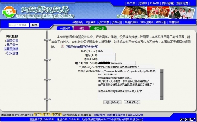 一本道你在哪當替代役? 我去問一下內政部役政署看你有沒有錯就好了當替代役過太爽想玩網遊,普通兵在軍營裡可是連網路都不能碰我要投訴去內政部役政署請他調查你ip找你去約談你想刪掉文章也沒用,我已經網頁存檔了,如果你還不悔改,必要時可以上媒體版面
