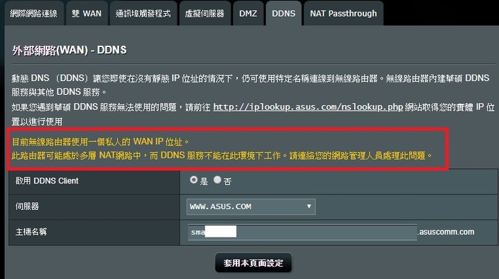 Eigen wrote:你確定 你了解 ddns...(恕刪) 不了解的是你DDNS是轉址服務必須需要真實IP不能用虛擬IP設定,樓主路由器是用4G網路,本身是虛擬IP,所以設定不了DDNS這點我在4樓就說過了,之後也有很多人提到但是ASUS ROUTER APP設定好可以穿過NAT的虛擬IP直接連ROUTER所以直接試它就好