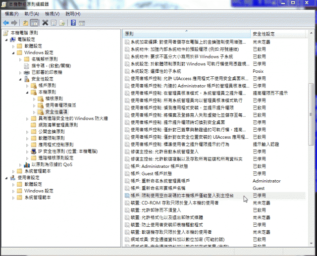 9再找→帳戶:限制使用空白密碼的本機帳戶僅能登入到主控台→原本是以啟用→請改為已停用