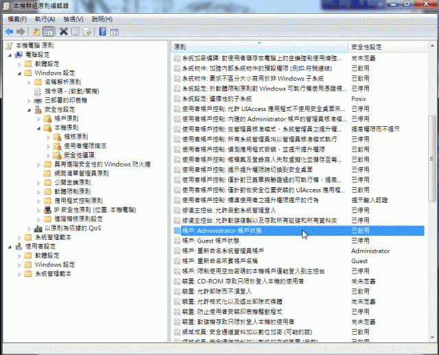 8在視窗中:電腦設定→Windows設定→本機原則→安全性選項→帳戶:Administrator帳戶狀態→