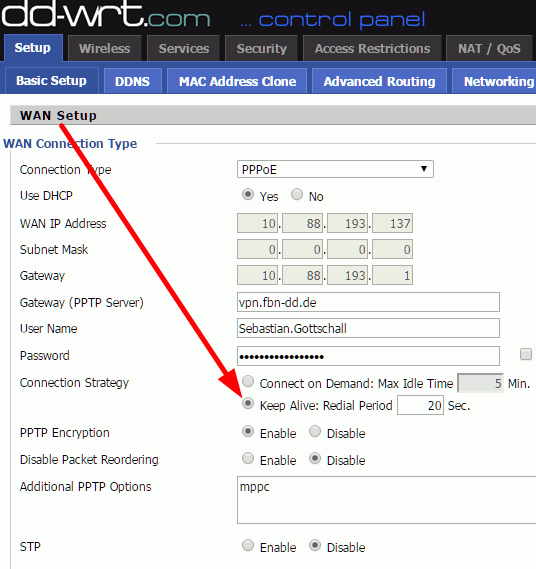 請問DD-WRT PPPOE的自動撥接問題, 我的ASUS WL 500W以刷DD-WRT的第三方韌體, 設定好PPPOE後也可以正常上網, 但前幾天中華機房維護時, VDSL斷線半小時, 就不能上網, 必需把WL500W重新開機或是進入dd-wrt的設定網頁來起動撥接後才能正常連線.