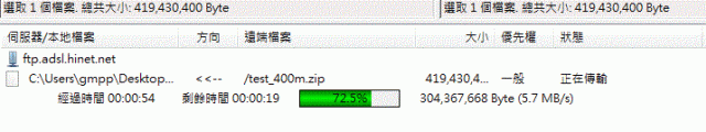 再次使用ftp.adsl.hinet.net進行速度的測試,卻可以完美&穩定的達到 5.8MB的下載速度。