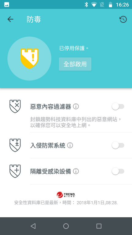 防毒功能預設是沒有打開的,點選"全部啟用"即可開啟防毒功能