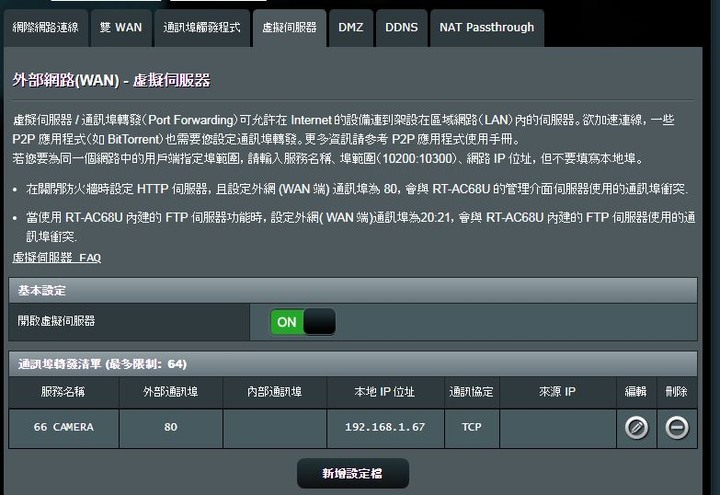 四、設定 rt-ac68u 的port forward 功能, 將 camera port forware 出來。