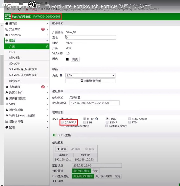 在這段教學影片上大約27:10的地方說明如何針對FortiSwtich上的VLAN開啟CAPWAP功能